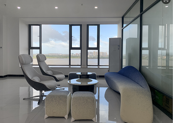 辦公場地從原先的 400 多平擴大至 800 多平,新址位于海南省海口市美蘭區(qū)濱江路 80 號灃辰外灘 B 座 12 樓,抵達(dá) 12 樓,自動門打開首先映入眼簾的就是明亮大氣的登尼特前臺。