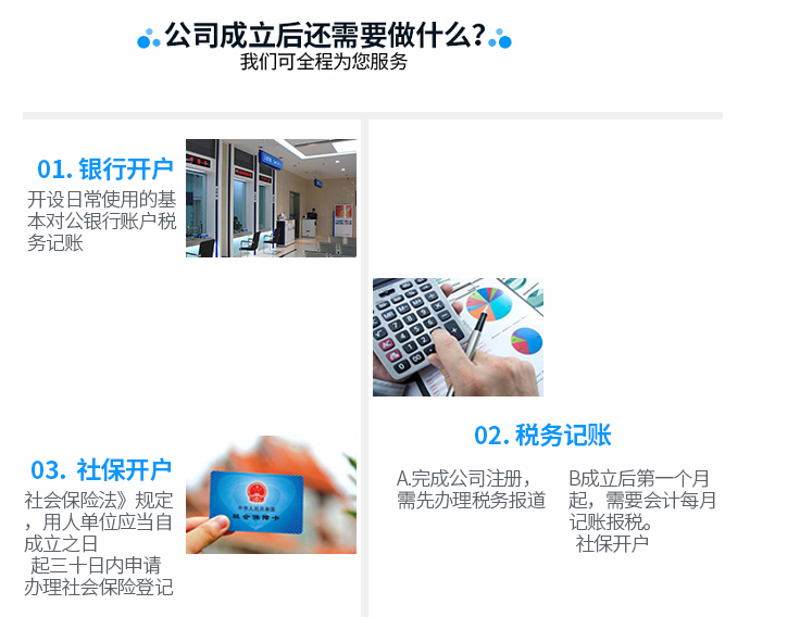 其次是??谛鹿径悇?wù)記賬,已完成新公司注冊需要先去??诙悇?wù)局辦理稅務(wù)報道,在成立后一個月起會計每個月記賬報稅;再次是海口新公司社保開戶,社會保險法規(guī)定,用人單位應(yīng)當自成立之日起三十日內(nèi)申請辦理社會保險登記,至少繳納一人的保險。