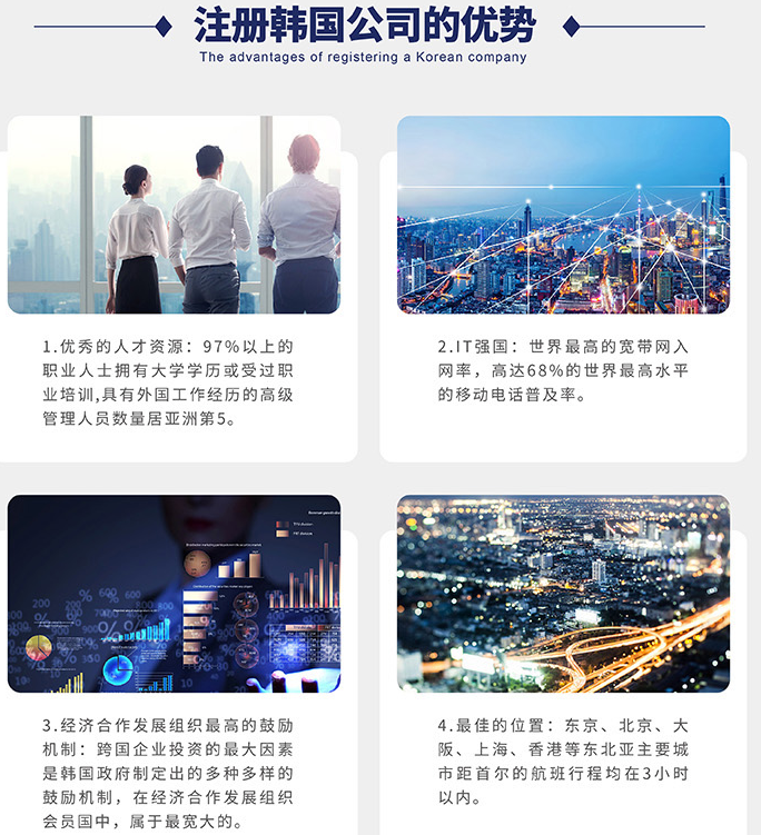 基于韓國雄厚的經(jīng)濟實力以及一系列利好的外商投資政策,很多中國企業(yè)想在韓國投資創(chuàng)業(yè),注冊韓國公司。對于中國內(nèi)陸企業(yè)而言,在韓國成立公司,有著諸多優(yōu)勢: