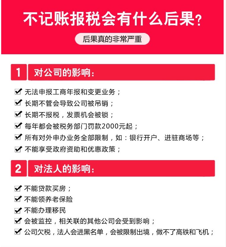 海南公司不記賬報(bào)稅會(huì)有什么后果,首先影響比較大是法人,法人代表無(wú)法貸款買房,不能辦移民、不能領(lǐng)養(yǎng)老保險(xiǎn)等后果、再次是對(duì)于公司的后果也很嚴(yán)重,如產(chǎn)生罰款還被列入異常黑名單所有業(yè)務(wù)都被限制。